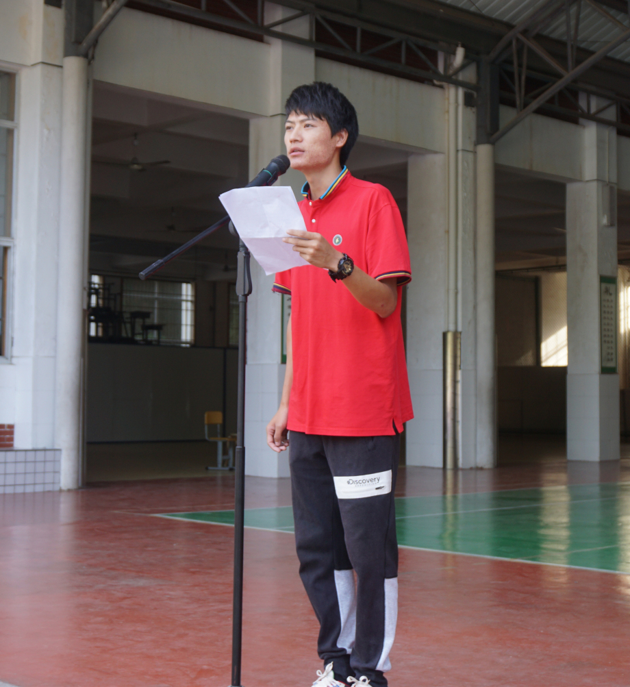 首先我要代表学校宣布一个喜讯。在开学前几周,我校1301班钟悦兮同学在长沙市第九届运动会游泳比赛近百人竞争中脱颖而出,并斩获三块金牌!让我们用最热烈的掌声祝贺钟悦兮同学!