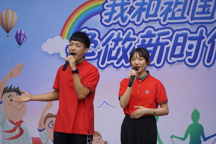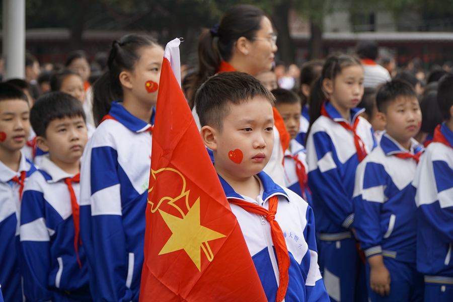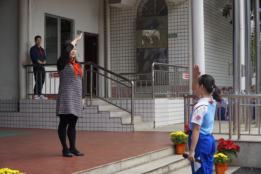 活动现场,国旗、队旗飘扬,少先队员们戴着鲜艳的红领巾、手持小国旗、排着整齐的列队,踏着音乐精神饱满地进入操场。活动在雄壮的出旗曲中拉开了序幕,全体队员在陈弈涵同学的指挥下齐唱《中国少年先锋队队歌》,嘹亮的歌声响彻整个校园。 此次活动共分为四个篇章,歌唱祖国篇,市“三独”比赛获奖选手,深情歌唱祖国,愿祖国的明天更加美好;致敬领巾篇,礼仪小分队的同学为大家展示队礼以及红领巾佩戴,为四、五、六年级的队员更换大号红领巾,人大领巾大,人大志向大,这一仪式,增强了作为一名少先队员,对红领巾的崇敬感和使命感;领巾飞扬篇,由红领巾啦啦操社团以及1601班优秀队员为师生们带来节目《红领巾飘起来》,快乐的歌声响彻天空,优美的舞姿一展风采;爱国奋进篇,在李添韵和周帆老师的带领下,全校师生一同唱响《我爱你中国》,用满怀豪情的歌声,祝福我们伟大的祖国繁荣昌盛。