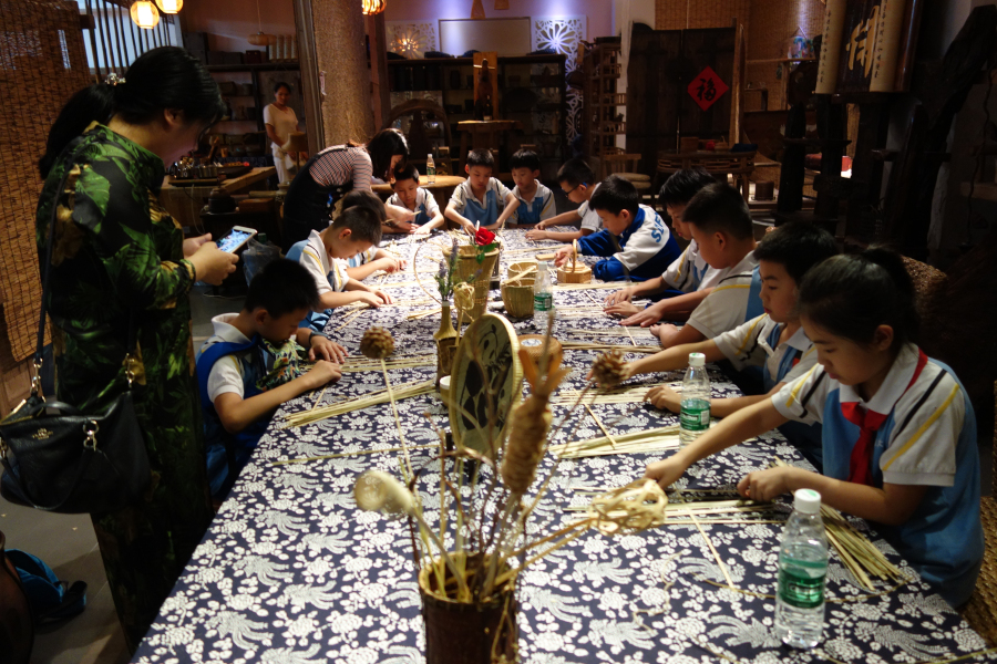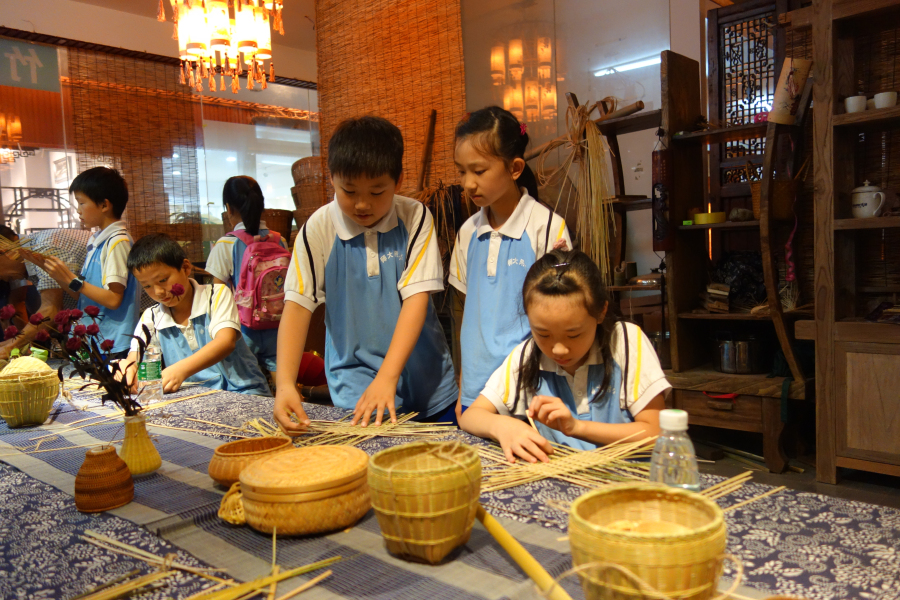 接下来体验非物质文化遗产的时刻到来了,同学们根据兴趣爱好分成了三个项目小组:古筝、剪纸、竹艺。在三个非遗项目的体验馆中,同学们专心致志地弹古筝、刻剪纸、编竹艺,个个勤学好问、心灵手巧,学得像模像样。经过非遗项目传承人耐心细致、手把手地传教,经过同学们不懈地努力,一件件作品纷纷展现在同学们的手中:有美妙悠扬的古曲旋律,有多彩多姿的各色剪纸,有细竹条编织而成的小船和果盘。同学们把玩着自己亲手制作的非遗传承项目的作品,喜悦之情溢于言表。