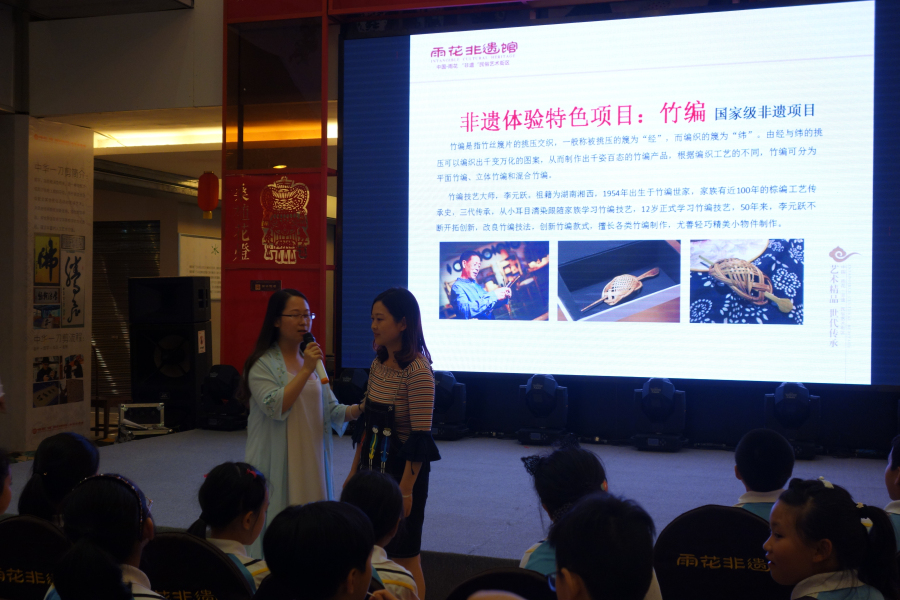 同学们来到长沙市雨花区湖南雨花非遗馆后,首先观看了有关湖南省非物质文化遗产的介绍影片,聆听了工作人员对非遗馆的馆藏非遗项目的介绍,还与三个非遗项目的传承人见了面。同学们认真地观看和聆听,兴致勃勃地回答了工作人员的提问,气氛热烈而活泼。