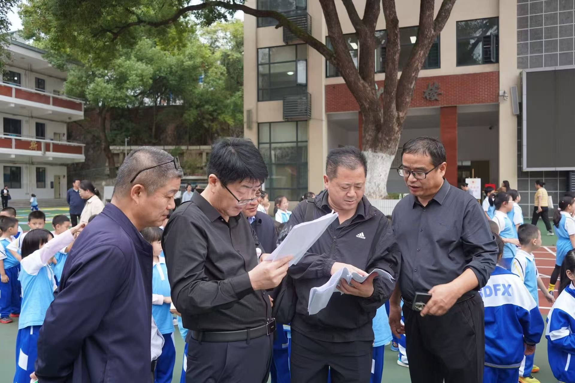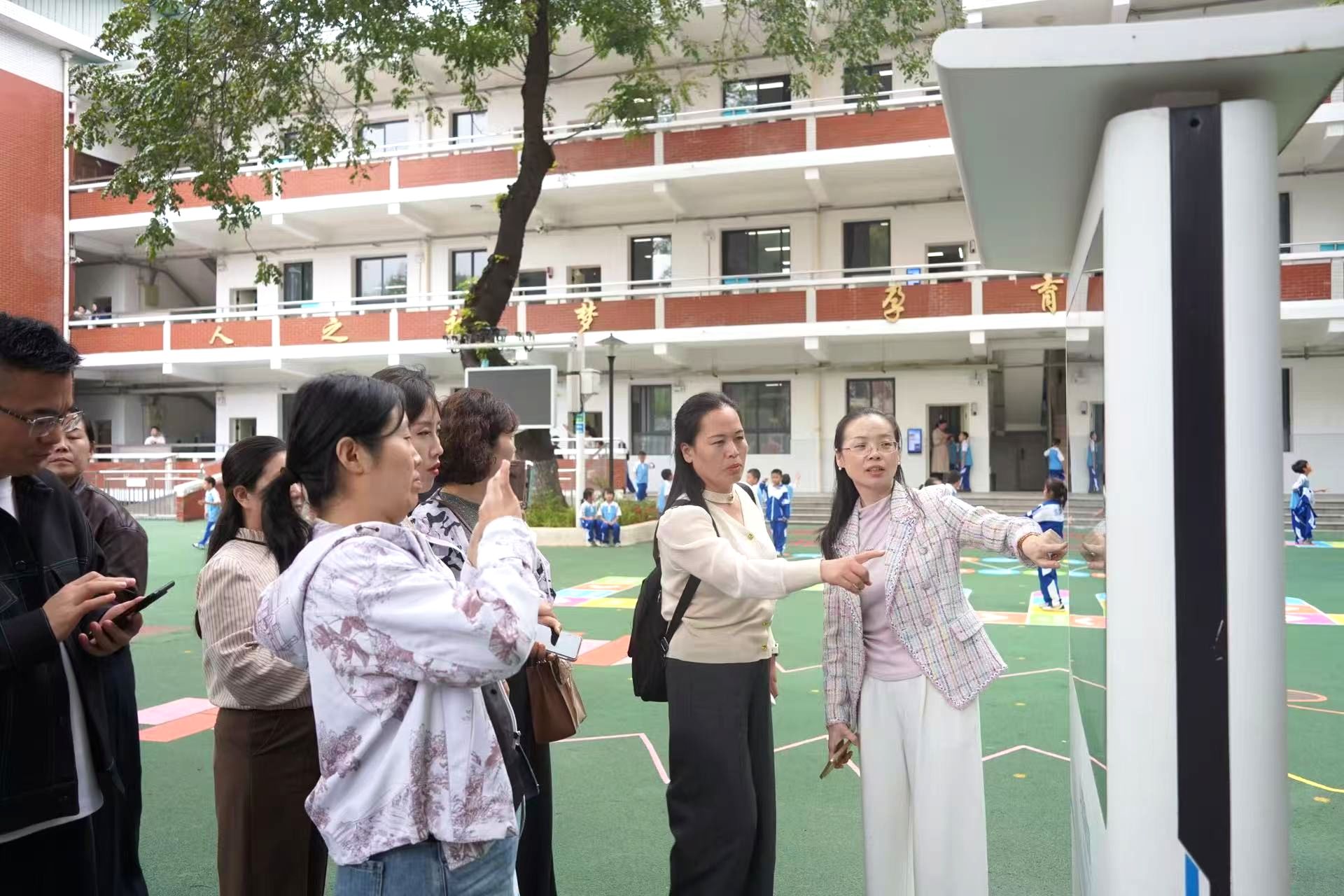 副校长夏旺代表学校对来宾表示热烈欢迎。双方在校门口合影后,开始参观校园。期间,校长们对附小智慧体育课堂中的AI设备表现出浓厚兴趣,恰逢“2025年校园阳光体育节”热烈进行,嘉宾们驻足观看,切身感受附小学子蓬勃的朝气与校园洋溢的欢乐氛围。