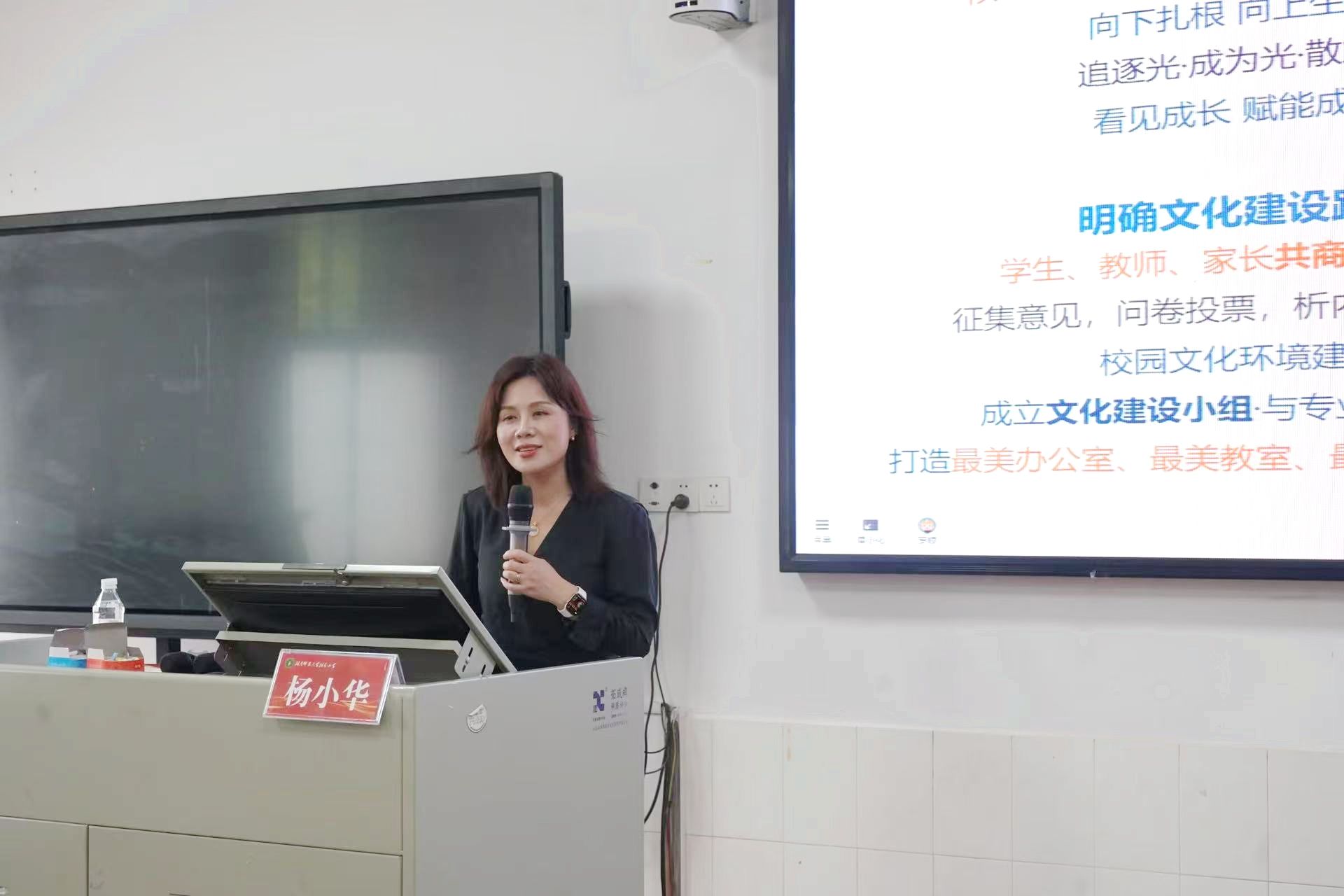 在随后的座谈会上,副校长杨小华以《办一所“拔节生长”的学校》为题作专题报告。她从制度构建、文化建设等方面,系统阐述了如何从理论到实践全方位、立体化地建设一所有内生力、有成长性的学校,分享了大量宝贵经验与务实做法。